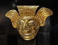 Gold mask with platinum eyes and teeth exhibited in the National Museum of Ecuador.