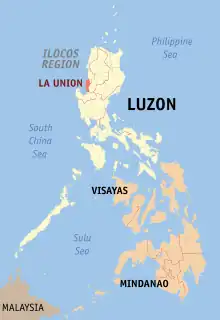 La Union's 1st congressional district is one of the two congressional districts of the Philippines in the province of La Union. It has been represented in the House of Representatives of the Philippines since 1916 and earlier in the Philippine Assembly from 1907 to 1916.[3] The district consists of the provincial capital city of San Fernando and adjacent municipalities of Bacnotan, Balaoan, Bangar, Luna, San Gabriel, San Juan, Santol and Sudipen. It is currently represented in the 19th Congress by Francisco Paolo Ortega of the Nationalist People's Coalition (NPC).[4]