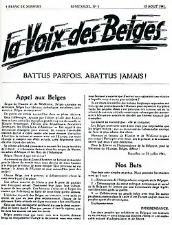 The Voice of the Belgians (French: La Voix des Belges, Dutch: de Stem der Belgen) was a bi-monthly clandestine newspaper published by the Belgian National Movement (MNB) during the German occupation in World War II.[1] In total, 41 issues were published.[2]