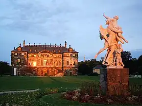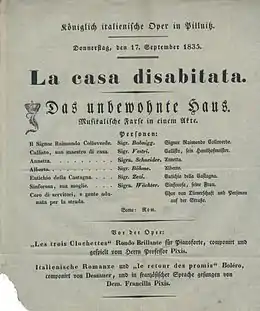 Princess Amalie's La casa disabitata was performed in the small court theatre of Pillnitz Castle on 17 September 1835. The evening also included Johann Pixis performing his piano composition Les trois Clochettes and his adopted daughter Francilla Pixis singing Dessauer's bolero "Le Retour des promis".[5] According to Prince Albert of Saxony, opera performances like this were generally for special court occasions and not repeated.[6] The Saxon State Library holds a copy of Friedrich Baumfelder's 1874 arrangement of one of the opera's arias ("Oh luce del giorno") and one other fragment.[7] However, the manuscript score of the opera itself had been amongst those confiscated by the Russian army at the end of World War II and taken back to Russia.[8]