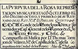 - ↑ English translation: La púrpura de la rosa, musical performance in festive celebration of the 18th birthday and first year of the reign of our King, Don Phelipe Quinto. ~ His Excellency, the Count of Monclova, Viceroy, Governor, and Captain General of the realms of Peru, Tierre Firme, and Chile & composed by Don Tomás de Torrejón de Velasco, music master of the Cathedral of Ciudad de los Reyes. In the year 1701. (Ciudad de los Reyes was the name for Lima during the Spanish Viceroyalty of Peru)