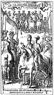 The invention of the heroic-comic poem in the Baroque period is usually ascribed to Alessandro Tassoni who, in 1622, published in Paris a poem entitled La Secchia Rapita.[2] Written in ottava rima, his "poema eroicomico" consists of twelve substantial cantos and deals with the regional rivalry between Ghibbeline Modena and Guelph Bologna in the 14th century. To avoid giving offence in a still divided Italy, the book was first published from Paris under the name of Androvinci Melisone,[3] but was soon afterwards reprinted in Venice with illustrations by Gasparo Salviani, and with the author’s real name.[4]