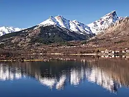 The Lac de Calacuccia is formed by damming the Golo river just south of the village of Calacuccia. It is at an elevation of 793 metres (2,602 ft).[1] The eastern part of the reservoir is in the canton of Calacuccia while the western part is in the commune of Casamaccioli. The northwest of the reservoir, where the Golo enters, is in the commune of Albertacce.[2] Other inflows include the Ruisseau de Lavertacce and Ruisseau de Ruggi from the south, and the Ruisseau di u Mulinellu, Ruisseau de Sialari and Ruisseau de Vergoleilu from the north.[3]