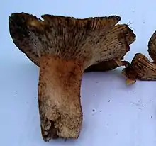 The cap of L. rupestris is 60–70 mm (2.4–2.8 in), concave to somewhat funnel-shaped, with a central depression. Its color is orange at the center to brownish-orange towards the margin. The cap surface is somewhat sticky, and the texture is either smooth to slightly cracked. It has an indistinct layer of matted mycelial "hairs". The margin lacks striations and grooves, and is curled inward slightly. The gills are slightly decurrent (running slightly down the length of the stem), cream-salmon in color, and crowded closely together. They are up to 3 mm (0.12 in) broad and are frequently branched. The gill edges are smooth, and the same color as the gill face. There are several tiers of lamellulae (short gills that do not extend fully from the cap margin to the stem) interspersed between the gills. The stem is 35–45 mm (1.4–1.8 in) long by 18–21 mm (0.71–0.83 in) thick, centrally attached to the stem, cylindrical, and tapers slightly near the base. It is pale ochraceous-salmon, and slight longitudinal ribs can be seen with a magnifying glass. The flesh is spongy, pale yellow-ochre in the cap, and cream-yellow in the stem. The latex is cream-colored to roughly the same color as the gills, and not abundant.[1]