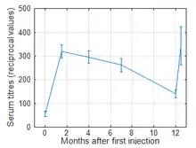 The usual vaccination schedule of Gynatren is 3 intramuscular injections of 0.5 ml vaccine at intervals of 2 weeks, followed by a booster dose of 0.5 ml 6–12 months after the first injection.[38] The booster injection raises the serum antibody titres in most cases back to similar levels to those found shortly after primary vaccination and ensures renewed immune protection for about 2 further years.[38][41] Grčić et al. recommends the periodic administration of booster doses every 2 years to maintain protective immunity for many years.[41]