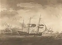 ![]() Robert Dodd: Lady Juliana in tow of the Pallas Frigate. The Sailors Fishing the main Mast which was shatter'd by Lightning. | |