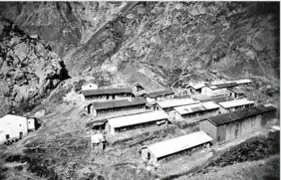 In order to make works possible, a sort of guesting village was established for 800 operators. There were 12 huts for workers and 2 huts for the chiefs placed in the area where nowadays Antonio Curò Shelter lies. Works were coordinated from a designated position situated slightly below Barbellino Plain, near Valmorta Lake. The armoury of the building site was located in Maslana, a small mountain town with typical stone houses at 1.200 m. It contained explosives for the demolition of the rock necessary in order to insert the new frameworks of the dam in concrete. The explosives were carried by the operators' shoulders. Walking upwards for one hour and a half, they reached the building site of the dam. Those operators needed to be careful due to the high danger of the load.[10] Unfortunately, something happened: many operators charged of transporting the explosives were women, among them one lady stumbled and fell with the box of dynamite which killed her and other 2 women. The tragedy happened on the 25th of 1919 and in their memory, a commemorative plaque was built along the path of Maslana.[11]