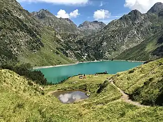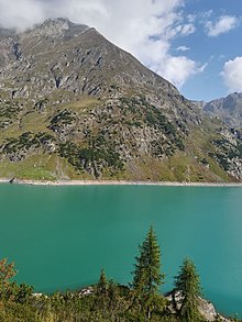 Lago del Barbellino is the largest artificial lake in the Province of Bergamo, Lombardy, Italy. It is located in Valbondione among the Bergamasque Alps. The reservoir contains 18.5 million cubic metres of water. In 1931 a dam was built to supply hydroelectric power to the Seriana Valley where the textile industry was rapidly developing.[1]