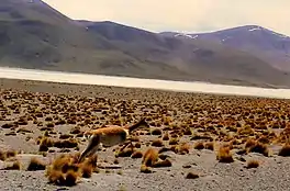 Laguna Vilama and some neighbouring lakes have been classified as Ramsar sites in 2000.[8] The environment around these lakes is called "Desert Puna" or "Salt Puna" and is uninhabited owing to its dry climate.[2] Vegetation includes ferns[13] and grasses in part associated with wetlands such as Festuca, Oxychloe andina, Parastrephia and Werneria pygmaea as well as Polylepis and Yareta. At Laguna Vilama and other lakes birds like Andean geese, Darwin's rhea, ducks and flamingos can be observed, mammals in the region include chinchillas, vicuñas and vizcachas.[4]
