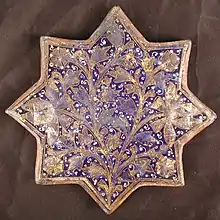 Lajvardina-type ceramics were developed in the 13th century following the Mongol invasion of Persia. It was produced throughout the Ilkhanate reign. It is characterized by its deep blue color and often features geometric patterns or foliage inlaid with gold leaf. The style was created using overglaze enamel. An initial layer of dark blue glaze, produced from cobalt, was applied, followed by another layer, often gold, on which the details were painted.[1] It was primarily produced in Kashan, a center for ceramic production and lusterware in the 12th and early 13th centuries.[2] The style was continuously used for tiles and ornamental objects from the 1260s C.E. until the mid-14th century, when production dropped significantly, coinciding with the fall of the Ilkhanate in 1335.[3]