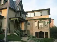 The Lake–Peterson House is one of the U.S. state of Illinois' finest examples of Gothic Revival architecture, specifically Victorian Gothic.[2] The asymmetrical two-story residence is constructed of yellow brick and sits upon a stone foundation. Its steeply pitched roof is clad in slate tiles and each of the four sides of the original home features a decorative gable.[3] The house also features tall brick chimneys with corbelled chimney caps, dormers, bay windows and a large veranda.[3] The architect, if there was one, is unknown, though it is probable that Lake himself was the builder.[2] One possibility is that John Lake obtained the architectural plans in England, his native land, where he had returned from as construction on the house began in 1873.[3]