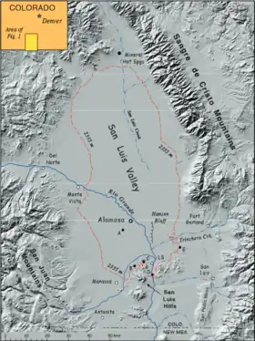 Saddleback Mountain was an island in Lake Alamosa, and its northern side was swept by waves during storms owing to the lake's long fetch.[2] Additional islands were located in its southern basin; today they are hills.[4] The city of Alamosa[8] and possibly also the town of Center, Colorado are located within the former lake's floor.[9] San Luis Lake presently occupies a small basin in the former lake floor;[10] the basin was previously occupied by a leftover of Lake Alamosa, Lake Sipapu.[11]