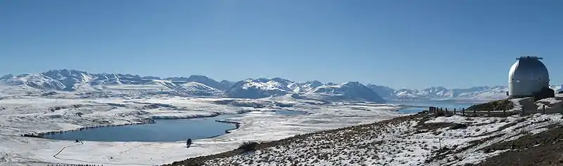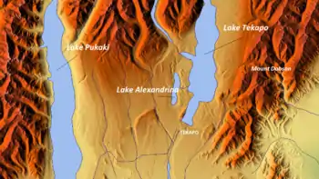 Lake Alexandrina (Māori: Whakatukumoana) is a lake located in the Mackenzie Basin of New Zealand's South Island. It lies immediately to the west of the much larger Lake Tekapo and further to the east of Lake Pukaki, located to the north of Lake Tekapo township. It is a shallow lake with distinct indications of glacial origin and is spring fed with an outlet on its eastern shore midway down the lake.[2][3] The outlet feeds into a smaller lake, Lake MacGregor before feeding into Lake Tekapo described as “Opaque and milky blue” in colour.[3] In the desert terrain of the Mackenzie Plains, Lake Alexandrina is considered as an “oasis of life”. Lake Alexandrina is a Wildlife Refuge and a delight to a fisherman, well documented for its brown and rainbow trout and salmon.[4]