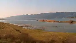 Lake Amvrakia lies along a depression northwest of Lake Ozeros and west of Mount Thyamos or Petalas. Its total surface area used to be 13.6 km2, but that area has shrunk drastically in recent years. One of the reasons for this reduction in size was a long drought and the other was the draining of the shallow northern section of the basin, which is currently cut off by an embankment created for the national highway. This drainage had a severe impact on the lake's size, owing to the small size of the basin (112 km2.).[1]