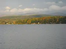 Lake Bomoseen (/ˈbɑːməzn/ BAH-muh-zeen)[1] is a freshwater lake in the western part of the U.S. state of Vermont in the towns of Castleton and Hubbardton in Rutland County. It is the largest lake that lies entirely within the state's boundaries, with a surface area of approximately 2,400 acres (9.6 km2). The lake was formed by glaciation and has an average and maximum depth of 27 feet (8.2 m) and 65 feet (19.8 m), respectively. It drains a 24,770-acre (100.25 km2) watershed, has five major inlets, and empties to the Castleton River, a tributary of the Poultney River, which in turn flows west to East Bay at the southern end of Lake Champlain.