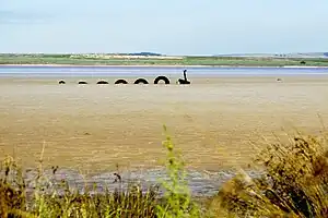 Efficiency of transportation was improved in 1926 after a 9 km (5.5 mi)[12] branch line was built from the nearby Salisbury railway line,[13] enabling transport directly to Port Adelaide.[10][note 2] During World War II, when salt was need for munitions manufacture, employment rose from 30 to 100 workers, with three shifts a day, and two trains a week transported the product in bags.[14] In 1967, 1000 tonnes a day were harvested; at that time South Australia was producing 80 per cent of Australia's salt, although that soon decreased, with major expansion of solar salt production in Western Australia. Forty years later, average annual production was reported as 10,000 tonnes (11,000 tons).[9] From 1996 to 2012, the works closed and no salt was harvested.[14] With harvesting becoming practicable using only front-end loaders and trucks, the maintenance and salt works buildings became redundant and were demolished in 2000.[7][8]