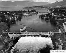 The Chelan River has a history of dam development for navigation, power generation, and water supply. In 1894, floodwaters pushed the lake level 11 feet (3.4 m) above the old (pre-project) high-water mark. The future spillway segment of the dam was calculated and built to avoid a recurrence of such flooding. The dam was built to raise the level of Lake Chelan and completed in 1892. It was constructed to provide water for south Chelan real estate and navigation to the city of Chelan. It washed out during June of that year, only to be replaced by another structure built by the newly formed Chelan Water Power Company in 1893. The larger and stronger dam was designed to raise the lake level enough to allow steamships to land at Chelan. Nevertheless, this structure lasted only a year before washing out in a massive flood in June 1894. In early 1899, M.M. Kingman purchased the Chelan Water Power Company and built another dam, for power generation. The turning on of lights was celebrated in Chelan during May 1903. The Chelan Water Power Company was purchased by the Chelan Electric Company in 1906. It was then purchased by Spokane-based Washington Water Power Company in 1925. A year later, Washington Water Power received a 50-year federal license to construct the existing dam and powerhouse. The first generating unit was placed in commercial operation in September 1927, followed by the second unit 11 months later.
