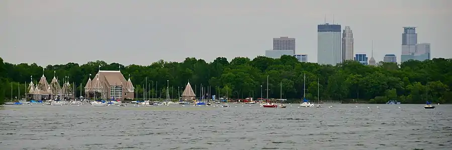 Lake Harriet pavilion complex, sailboats on the lake, and Minneapolis skyline