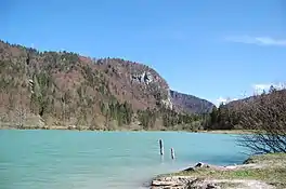 Lake Kreda is a man-made lake in the Radovna Valley in northwestern Slovenia. The lake got its name from the chalk (Slovene: kreda) that was mined in the area until 1985. The digging also created a basin, which gradually filled with water and the lake appeared. The mining ceased because it was unprofitable and due to conservation concerns (the area is within Triglav National Park), but the lake remained and is now occasionally used as a recreation site.