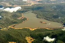 The area was renamed by colonials "Kearney's Bogs" and then Lake Leake after the dam was constructed. The reservoir was constructed after a long debate. A 5-metre (16 ft) high dam was finished in 1884. The initial capacity was 19.9 cubic metres (700 cu ft) and an area of 6 square kilometres (2.3 sq mi). In 1971 the spillway highest point was raised by 18 centimetres (7.1 in) to increase storage capacity. Water is released for irrigation and also stored to maintain a fishing facility. Lake Leake is usually at least half full.[8]