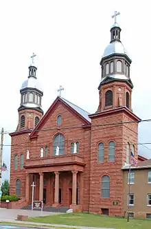 In the next block is St Joseph's Church (1901) at 701 Calumet, built of rough sandstone blocks.[1] The church is front-gabled with round arched windows, with two steeples with domed caps frame the roofline.[1] The church was built in the French Canadian tradition to serve the growing French Canadian population of the area.[1]