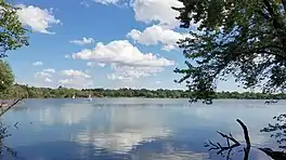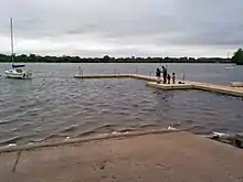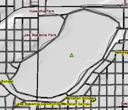 Lake Nokomis is one of several lakes in Minneapolis, Minnesota, and part of the city's Chain of Lakes. The lake was previously named Lake Amelia in honor of Captain George Gooding's daughter, Amelia, in 1819. Its current name was adopted in 1910 to honor Nokomis, grandmother of Hiawatha.[1] It is located in the southern part of the city, west of the Mississippi River and south of Lake Hiawatha. The lake is oval in shape, with a long axis running southwest to northeast. Two pathways circle the lake, a 2.7-mile (4.3 km) pedestrian trail and a 2.8-mile (4.5 km) bicycle trail.[2] Because the lower part of the lake is crossed by Cedar Avenue running north-south, the impression from the ground is that the lake is shaped like an L. The lake has an area of 204 acres (0.83 km2).