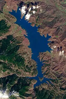 Lake Plastiras (Greek: Λίμνη Πλαστήρα) also called Tavropos Reservoir (Greek: Τεχνητή Λίμνη Ταυρωπού) is an artificial lake fed by Tavropos (Megdovas) river, located in Karditsa regional unit, near the city of Karditsa, Greece. The lake is named after the Greek general and politician Nikolaos Plastiras, who was the first to visualize the construction of an artificial lake in the area.