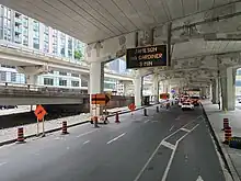 - ↑ "Google Maps view of one-lane Lake Shore Blvd. merging with the eastbound Gardiner Expwy. offramp".