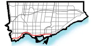 | Browns Line Kipling Avenue Islington Avenue Royal York Road Parklawn Road Parkside Drive Bathurst Street Spadina Avenue Bay Street Yonge Street Jarvis Street Sherbourne Street Parliament Street / Queens Quay Leslie Street | |||||||