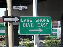 Lake Shore Boulevard is commonly compounded as Lakeshore Boulevard. Many traffic signs, transit shelters and other signs contradict each other, sometimes on the same corner, as illustrated in the photograph. According to the official bylaws that designated the road, the correct format is "Lake Shore Boulevard". This mistake is likely due to confusion with Lakeshore Road to the west, where the single word format is actually correct.[3]