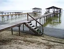 Lake Waccamaw is a fresh water lake located in Columbus County in North Carolina. It is the largest of the natural Carolina Bay lakes.[2] Although bay trees (Magnolia virginiana L., Gordonia lasianthus Ellis, and Persea) are present within many Carolina Bays,[3] the term "bay" does not refer to the trees but comes instead from an early science publication by Glenn (1895), who used the word "bay" (which he described as "lake-like expanses") to refer to these features near the town of Darlington, South Carolina.[4] Lake Waccamaw is fed by four creeks: First, Second, Third, and Big creeks. The outlet forms the Waccamaw River which flows south-southwest to empty into the Atlantic Ocean near Georgetown, South Carolina