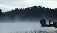 Other geographical features include Panekiri Bluff and Puketukutuku Peninsula, which is the site of a kiwi-conservation programme. Surrounded by mountains clad with native forest which has never been logged, Waikaremoana is regarded as the North Island's most attractive lake. Many native bird-species scarce in most other parts of the North Island occur in the area. A possum-hunting programme operates in the area to help protect the forest. Numerous understory species grow within the forested area of the catchment basin, crown fern (Lomaria discolor), for example.[4] Since at least the early 1900s lake-bottom molluscs have been studied by Colenso (1811-1899) and others.[5]