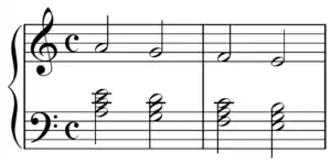 In music, the lament bass is a ground bass, built from a descending perfect fourth from tonic to dominant, with each step harmonized.[1] The diatonic version is the upper tetrachord from the natural minor scale,[2] known as the Phrygian tetrachord, while the chromatic version, the chromatic fourth, has all semitones filled in. It is often used in music to denote tragedy or sorrow.[3]