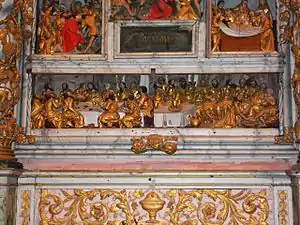 The Last Supper and Jesus washing his disciples' feet. Part of the altarpiece of the Passion at Lampaul-Guimiliau
