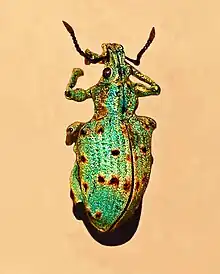 Lamprocyphus germari can reach a length of about 23 millimetres (0.91 in). This rare beetle is glossy, light green, with black spots surrounded by coppery scales.