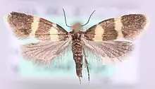 The wingspan is 9-11.5 mm. The forewings are brown with a purple and yellowish sheen and two pale yellow transverse bands.[2] Adults are on wing in May and June.