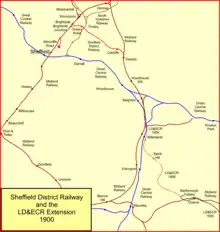 The Sheffield branch was not completed, but interests in Sheffield encouraged its extension which was built by a nominally independent company, the Sheffield District Railway, sponsored by the LD&ECR and the Great Eastern Railway with the support of the Midland Railway. It opened in 1900.