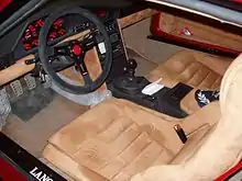 The Stradale's chassis was a space frame, similar to its rally counterpart, built out of CrMo steel tubes and aluminium alloy for the crash structures; it was covered by epoxy and fiberglass body panels. Like the rally car, the 1.8-litre four-cylinder engine was longitudinally mid-mounted, equipped with Weber-Marelli IAW integrated electronic ignition and fuel injection, a supercharger, a turbocharger and two intercoolers. In road tune the 1.8 produced 250 PS (184 kW; 247 hp)[8] at 6750 rpm and 291 N⋅m (215 lb⋅ft) of torque at 4500 rpm.[6] The "Stradale" kept a three differential four-wheel-drive system from the rally car; the centre differential sent 30% of the engine torque to the front open differential, and 70% to the rear limited slip. The transmission remained a 5-speed but was a fully-synchronized unit built by CIMA.[3][9]