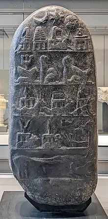 The Land grant to Marduk-apla-iddina kudurru is a grey limestone 0.7-meter tall ancient Mesopotamian narû or entitlement stele recording the gift of four tracts of cultivated land with settlements totaling 84 GUR 160 qa by Kassite king of Babylon, Meli-Šipak (c. 1186–1172 BC), to a person described as his servant (arassu irīm: “he granted his servant”) named Marduk-apla-iddina, who may be his son and/or successor or alternatively another homonymous individual. The large size of the grant together with the generous freedom from all territorial obligations (taxation, corvée, draft, foraging) has led historians to assume he was the prince. There are thirty six kudurrus which are placed on the basis of art-history to Meli-Šipak's reign, of which eight are specifically identified by his name.[1] This is the best preserved of all of them.