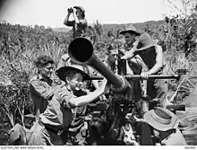 The Japanese positions were well-sited on the spur for an attack from the east along the track from Katika to Sattelberg, but at this point, Captain B. G. Cribb, the commander of D Company, 2/13th Infantry Battalion, came on the radio and announced that he was in contact with the Japanese to the west, and was going to attack from that direction. A furious fight ensured. The Japanese held their fire until the Australians were almost on top of them. Realising that the position was stronger than he had thought, Cribb withdrew after suffering eight dead and twenty wounded.[69][70] Windeyer ordered the 2/17th to bypass the position and proceed to its objective, the high ground south of the Song River. The 2/15th was ordered to attack Katika Spur.[68] The attack was delivered at 15:15 after a preliminary bombardment by 3 inch mortars, but the Japanese defenders had withdrawn, leaving behind eight dead.[70] By nightfall, most of the brigade was on their objectives.[68]