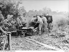 The sixth and final wave consisted of LST-18, LST-168, and LST-204.[38] They had instructions to wait until the smaller craft had cleared the beach, and beached at 06:50.[61] Each carried an unloading party of 100 men, drawn from the 2/23rd and 2/48th Infantry Battalions, and 2/2nd Machine Gun Battalion, who would return with the LSTs.[60] The unloading proceeded at a rapid pace. All the cargo was unloaded from two of the three when they retracted at 09:30, and headed off escorted by ten destroyers and the fleet tug USS Sonoma.[61] The 2/3rd Field Company, 2/1st Mechanical Equipment Company, 2/3rd Pioneer Battalion, and the Shore Battalion of the 532nd Engineer Boat and Shore Regiment prepared four beach exits. Stores were quickly moved off the beach to inland dumps.[62][63][58] Some 5,300 troops, 180 vehicles, 32 25-pounders and Bofors 40 mm guns, and 850 measurement tons (960 m3) of bulk stores had been unloaded.[64]