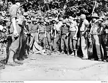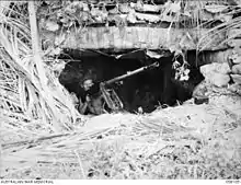 The attack was delivered but the assault companies were soon pinned down. "When a situation seemed desperate", historian David Dexter noted, "the Australian Army appeared to have the knack of producing a leader of the necessary character".[101] Sergeant G. R. Crawford led 11 and 12 Platoons of the 2/13th Infantry Battalion in a bayonet charge on the Japanese positions covering Ilebbe Creek. Private A. J. Rofle, firing a Bren gun from the hip, silenced one of the Japanese posts causing the most trouble. He went on to silence another, but was wounded trying to take out a third. Crawford's furious assault swept all before it. One post remained on Crawford's left, which was attacked with 2-inch mortars and attacked by 8 Platoon. The Japanese abandoned the post and withdrew into the Salankaua Plantation.[102] Rolfe and Crawford were awarded the Distinguished Conduct Medal.[103][104] The 2/13th Infantry Battalion lost 10 killed and 70 wounded; between 80 and 100 Japanese marines died.[105]
