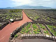 The landscape is characterized by an extensive network of long, spaced apart black basalt stone walls that run parallel to the coast and penetrate towards the interior of the island. These walls were erected to protect the vines from the wind and the salty sea spray, which are planted in thousands of small rectangular enclosures locally called currais. Also part of the landscape are the buildings (manor houses, wine cellars, warehouses, conventional houses, and churches), pathways and wells, ports and ramps, that were produced by generations of farmers enabling the production of wine. This landscape has evolved over 500 years and is exceptionally well-preserved and fully authentic in its setting, materials, continued use, function, traditions, techniques, and management systems.[1][2]