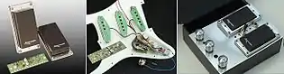 The notable feature of the Langcaster guitar is the application of the low impedance Ultimate Lo Pickups[12] which are an impedance of 100 Ohm. The Ultimate Lo Pickups are made by two stacked coils and winding techniques, mounted onto a PCB board in a single coil humbucker or Strat pickup cover housing. The pickups have eight magnetic poles to avoid dead spots when bending the thin strings and have an overdrive option with a gain control pot and do not hum.