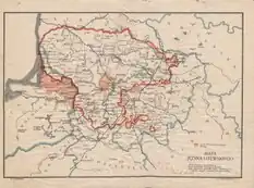 Territory where Lithuanian language was dominant in the 16th century according to the research of historians and linguists and a territory where Lithuanian language was dominant in the 1930s, a map by Polish linguist Jan Michał Rozwadowski shows a retreat of the language to the north and west and a language shift, most notably – around Vilnius.