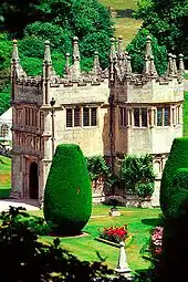 Lanhydrock estate belonged to the Augustinian priory of St Petroc at Bodmin but the Dissolution of the Monasteries during the 1530s saw it pass into private hands. In 1620 wealthy merchant Sir Richard Robartes, of Truro, acquired the estate and began building Lanhydrock House, designed to a four-sided layout around a central courtyard and constructed of grey granite. Robartes died in 1624 but work on the building was continued by his son John Robartes, 1st Earl of Radnor, a notable public figure who served as Lord Privy Seal and Lord President of the Council. The embattled walls were built of rude (rough), massive granite blocks with years 1636 and 1642 on the walls, indicating when they were built. A barbican gate was added and the house was garrisoned by Parliamentary forces in August 1644 when Sir Richard Grenville took possession.[5]