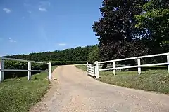 Track to grazing land. This track and fields belong to Lanwades Stud and are used by racehorses for grazing.
