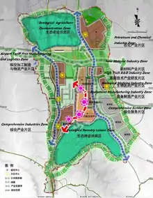 There are four functional zones: the 246-square-kilometer central development zone environs Zhongchuan International Airport (without airport controlled area) which includes industrial congregation zone, comprehensive service zone and airport tariff-free manufacturing and logistics zone; the 48-square-kilometer ecological leisure and business housing zone; 248-square-kilometer demonstration zone for developing barren wasteland and hills; 220-square-kilometer ecological demonstration zone of modern agriculture.