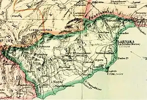 Some northern parts of the present District were at that time included in Famagusta District, namely Arsos, Athienou, Melousia, Troulli, Tremetousia and Pergamos. At the first British Census Larnaca District (i.e. both the caza and nahieh) had a population of 20,766.[5] By 1891 Athienou had been moved to Nicosia District,[6] while the other villages were later moved to Larnaca District. Athienou was united to Larnaca District in the 1920s.[7]