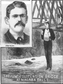 In early November 1886, he set his sights on Niagara Falls, apparently without immediate financial incentive, but with the hope of future returns.[22] He visited Niagara Falls to find a site to jump from, rejecting the "old bridge" at Falls View, a wood and steel suspension bridge[23] just below the rapids, before settling on the new Niagara Falls Suspension Bridge. This double-decker rail and carriage bridge was completed earlier that year, completely replacing an earlier suspension bridge on the same site, with minimal traffic disruption,[24] only to be itself replaced ten years later. That bridge had only seen one previous jump, by a Bellini in 1873, who performed a sort of bungee jump.[22]